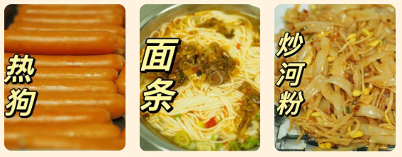 包子、白馒头、红糖馒头、花卷、鸡蛋、卤蛋、稀饭、发糕、玉米饼、烧麦、紫薯卷、麻圆、玉米热狗卷、蒸饺、蛋饺、大肉饼、脆香鸡、糯米鸡、玉米、鸡腿、手抓饼、红糖锅盔、椒盐土豆、纯肉肠、冒菜、炒面、炒粉、炒饭、米线、面条、牛肉丸、鸡肉饼;
