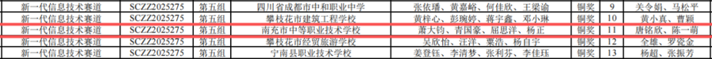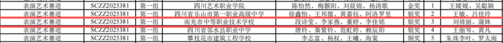 在2025年四川省职业院校技能大赛中职组比赛中,我校师生奋勇拼搏、脱颖而出。热烈祝贺刘倩丽、蒲姝、唐铭欣、陈一萌四位老师指导的学生团队,分别荣获表演艺术赛道银奖、新一代信息技术赛道铜奖,充分展现了学校技能育人的扎实成效。