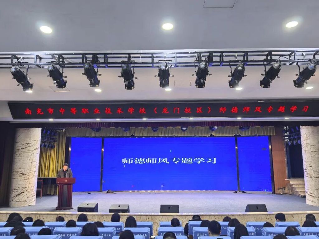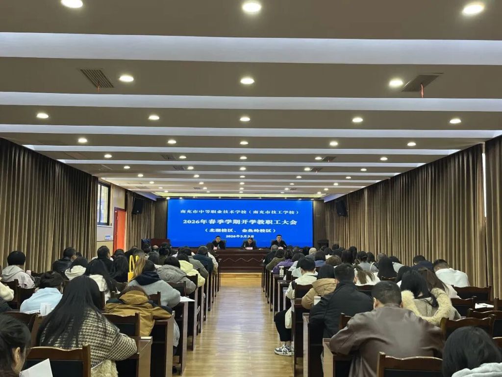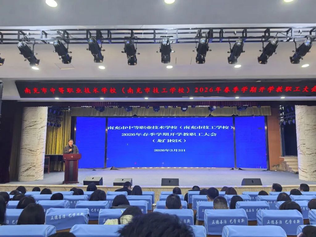 为确保新学期各项工作平稳有序开局,全面落实立德树人根本任务,扎实推进学校内涵建设与特色发展,3月3日上午,南充市中等职业技术学校(南充市技工学校)分校区同步召开2026年春季学期开学教职工大会。会议分别在龙门校区艺术中心学术厅和北湖校区实训楼多功能会议室举行,覆盖全校三个校区。学校党委委员、纪委书记徐黎明,党委委员、副校长何勇、姚钦烽、吴知了出席会议。会议分别由何校长、吴校长主持,全体教职工参加。