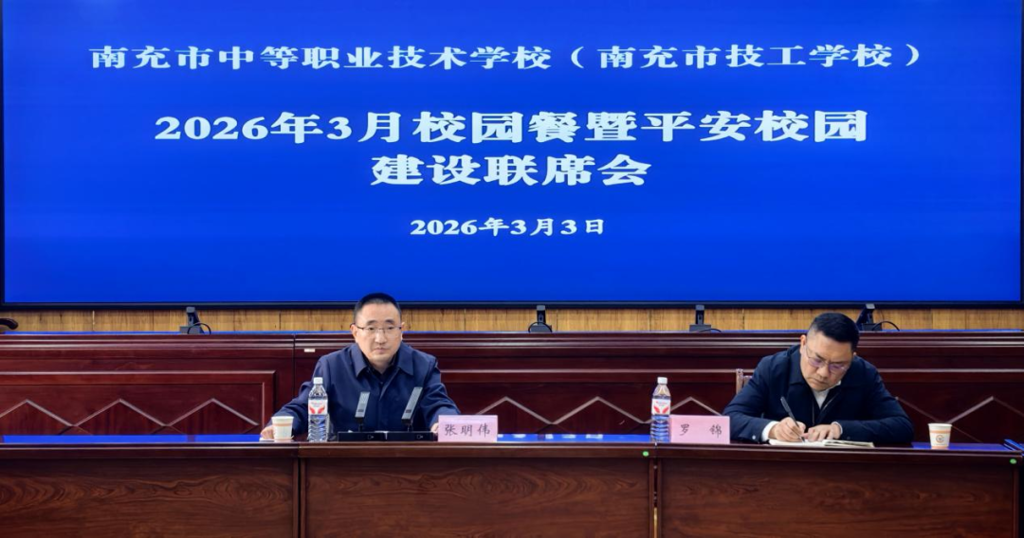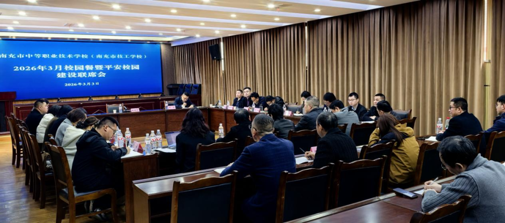 2026年3月3日上午,南充中等职业技术学校(南充市技工学校)在北湖校区实训楼三楼会议室组织召开校园餐暨平安校园建设联席会议。会议由学校党委书记张明伟主持,党委副书记、校长罗锦及学校领导班子成员、相关职能部门负责人及两校区食堂、保安、宿管服务合作方代表参加会议。会议就新学期校园安全与食品安全工作进行专题部署,着力强化师生安全保障工作,确保学校开学平稳顺利推进。
