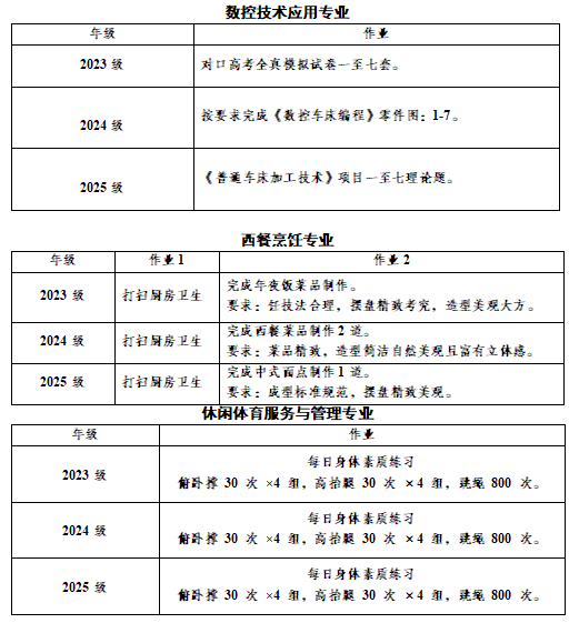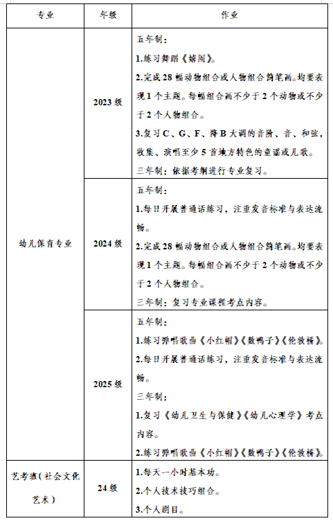 各专业假期作业安排