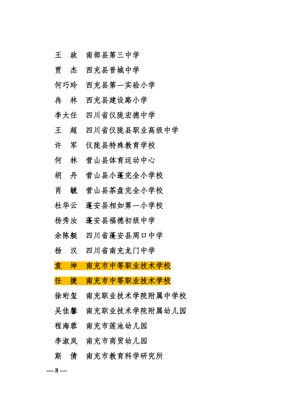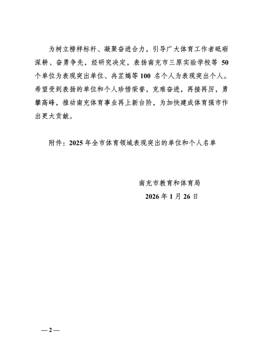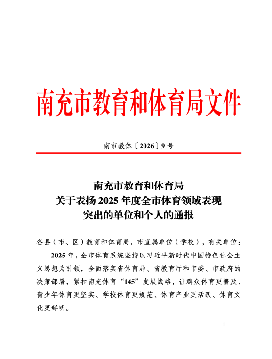 近日,南充市教育和体育局印发《关于表扬2025年度全市体育领域表现突出的单位和个人的通报》(南市教体〔2026〕9号),我校袁坤老师、任捷老师凭借在青少年体育工作中的扎实表现与突出贡献,成功获评“2025年度全市体育领域表现突出个人”荣誉称号!